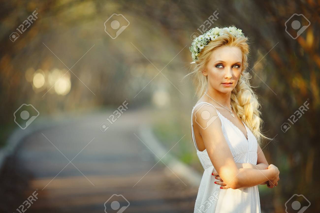 Belle Femme Blonde En Robe Blanche Et Couronne De Fleurs Sur La Tête. Personne Mignonne Dans La Ruelle. Banque D'Images et Photos Libres De Droits. Image 99621694