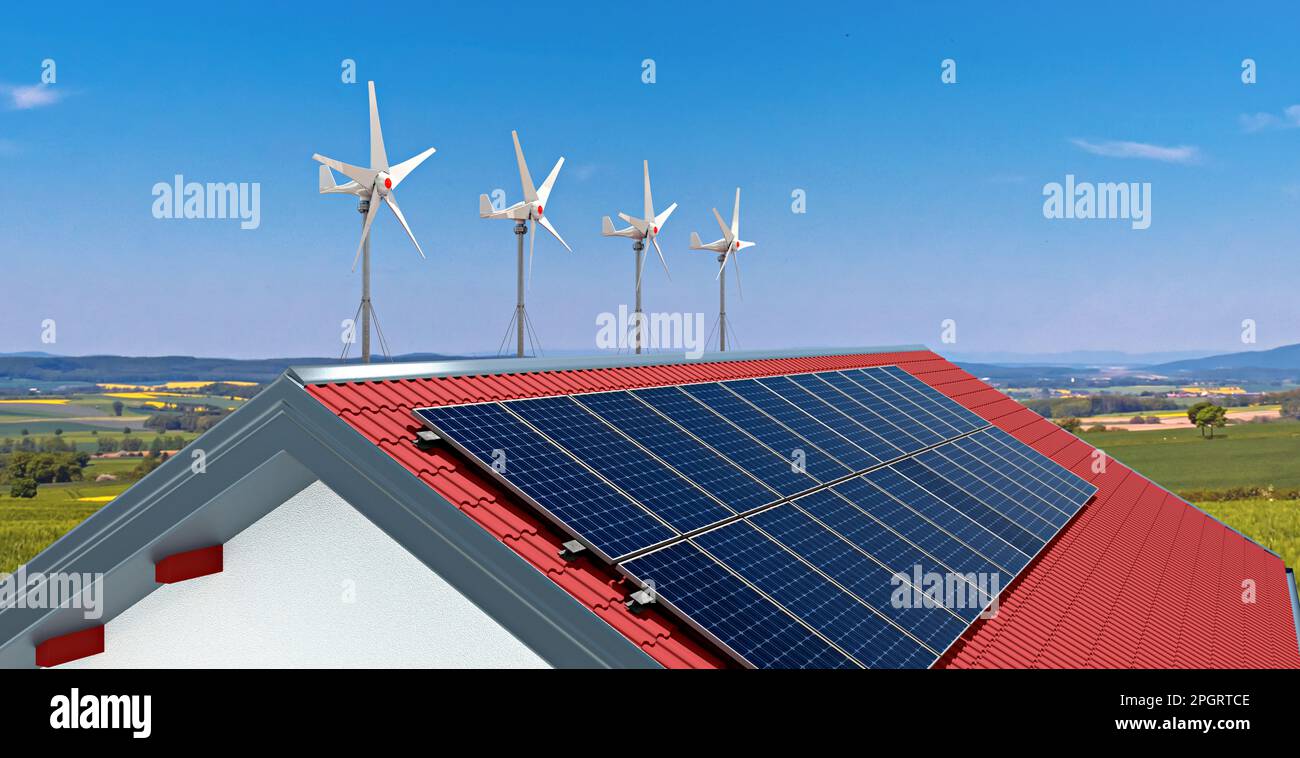 Petites éoliennes et panneaux d'énergie solaire sur le toit d'une maison privée, 3D Illustration Photo Stock - Alamy