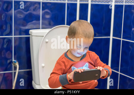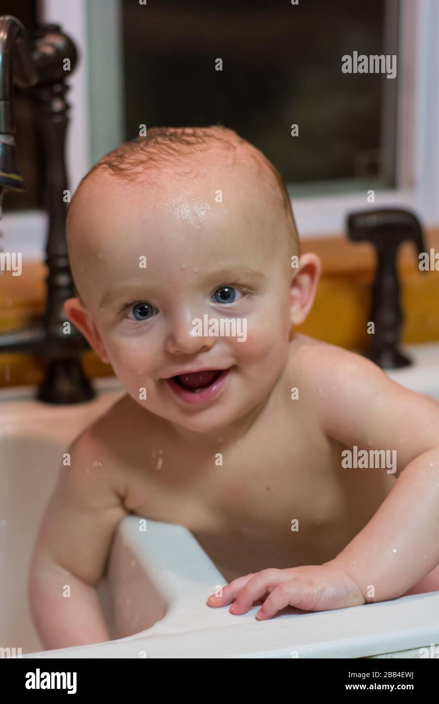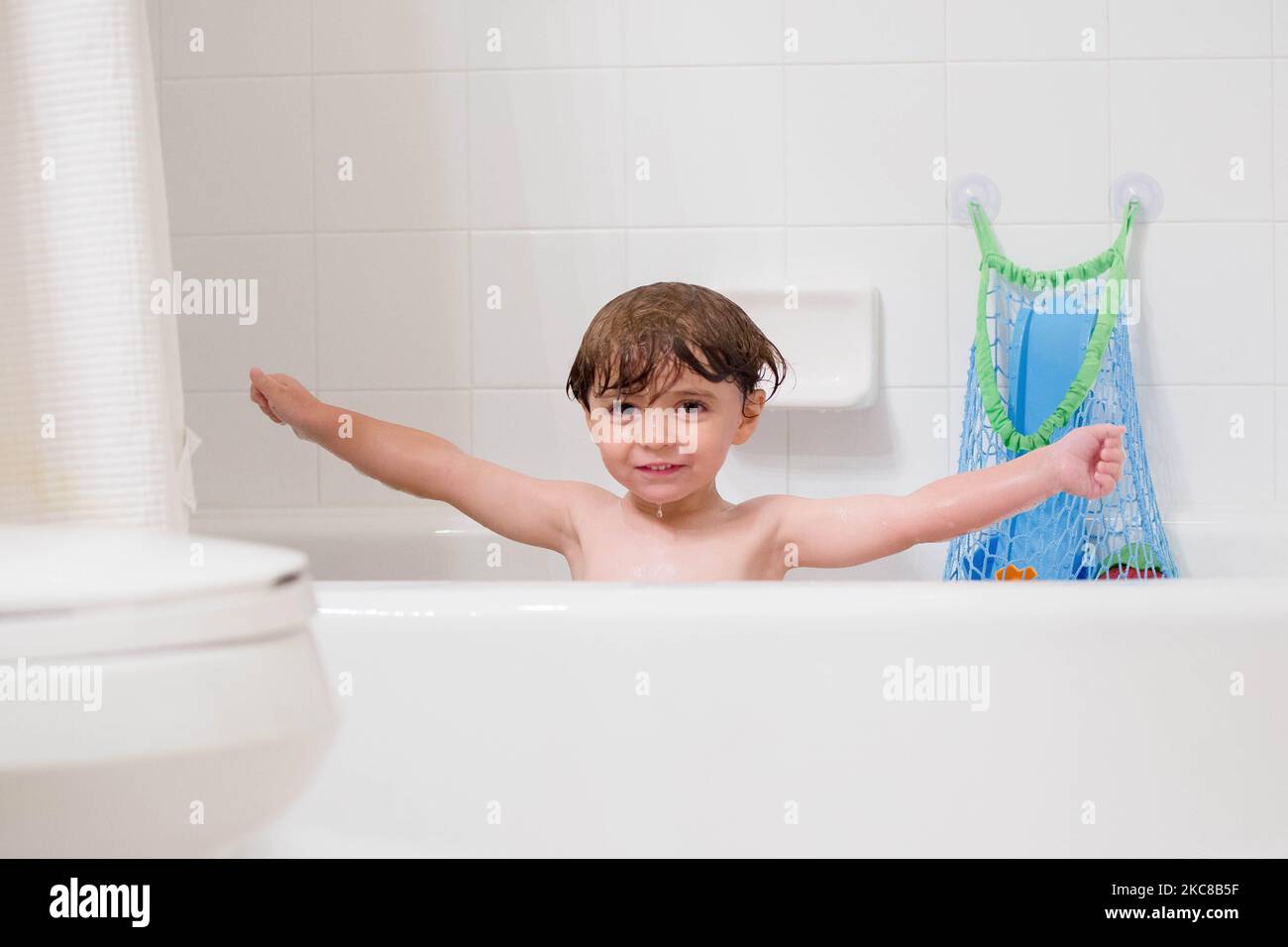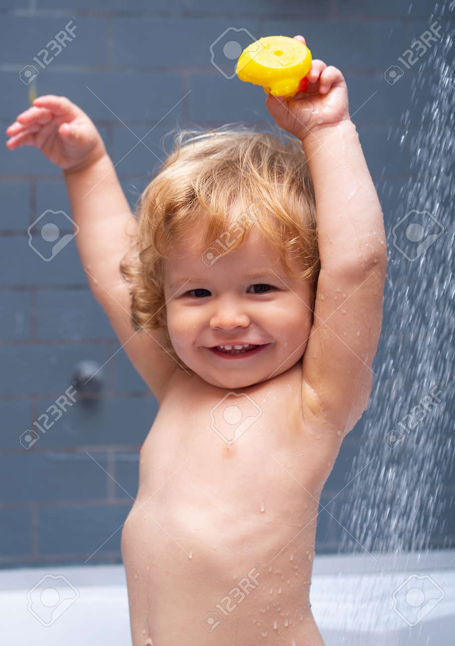 Adorable petit garçon dans la salle de bains, prenant une douche, souriant avec joie à l'appareil photo Photo Stock - Alamy