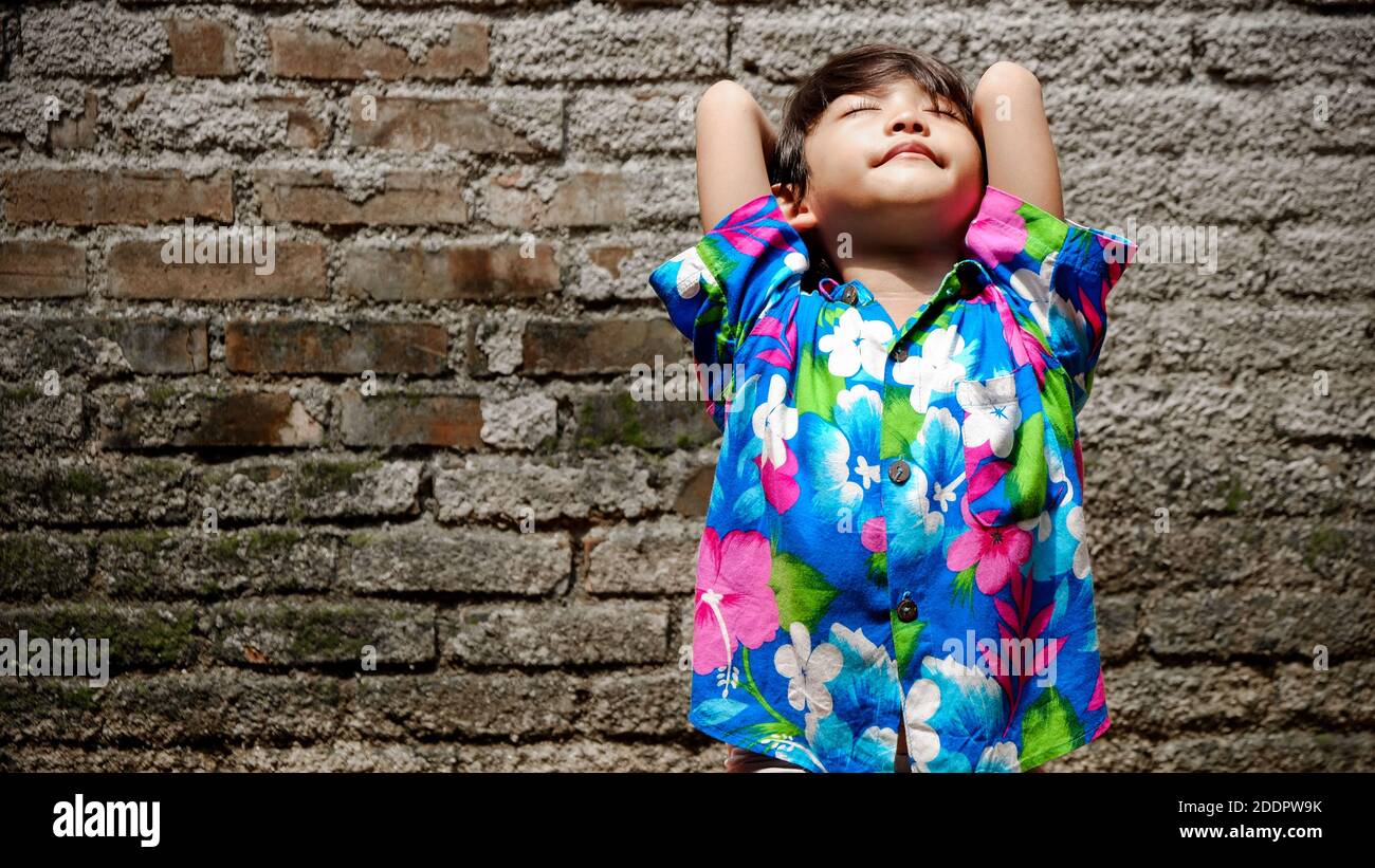 Joyeux petit garçon d'origine ethnique d'Asie du Sud-est en prenant un bain de soleil le matin à l'arrière-cour à la maison Photo Stock - Alamy
