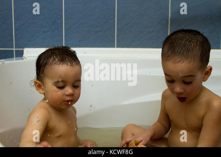Happy Frères Et S?urs: Deux Petits Jumeaux Garçons Qui S'amusent Avec De L'eau En Prenant Un Bain Dans La Baignoire Banque D'Images et Photos Libres De Droits. Image 28906363