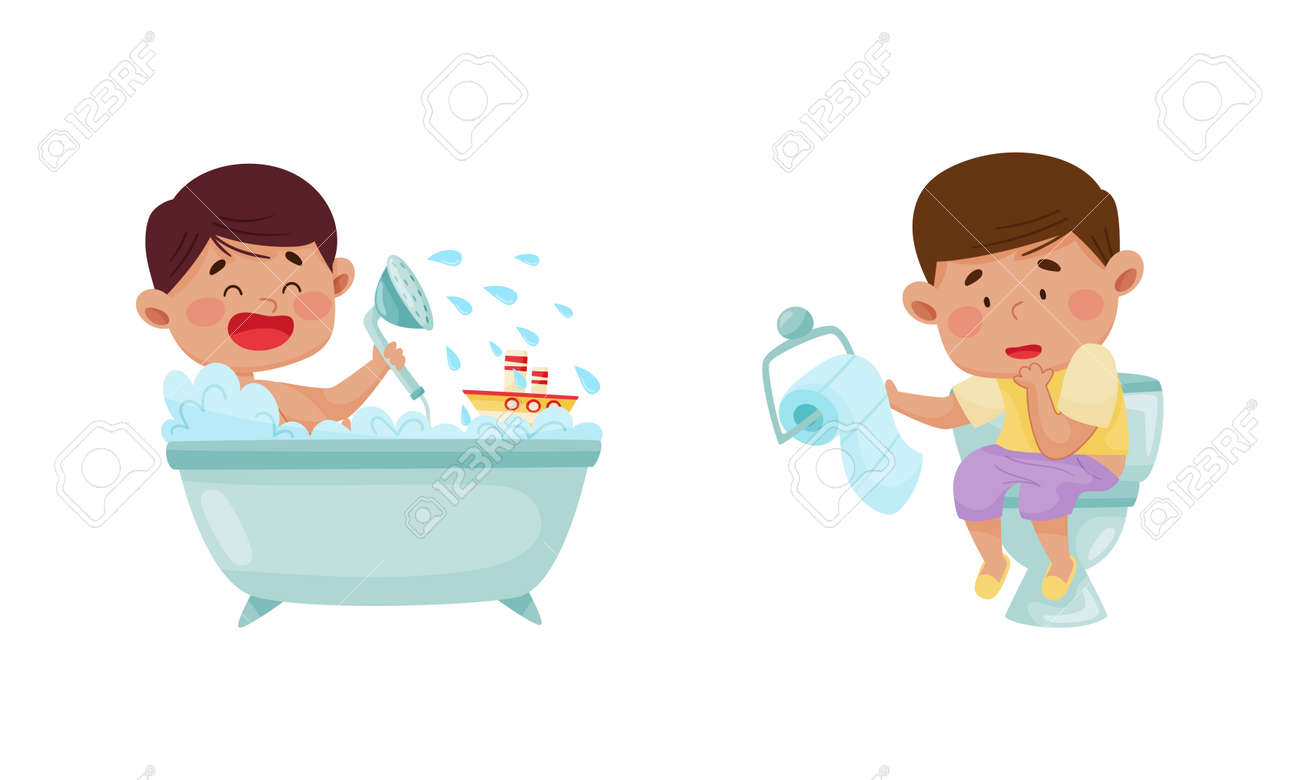 Ensemble De Routine Quotidienne Pour Enfants Mignons Et Heureux. Petits Garçons Prenant Un Bain Et Assis Sur L'illustration Vectorielle De Dessin Animé De Toilette Clip Art Libres De Droits, Svg, Vecteurs Et