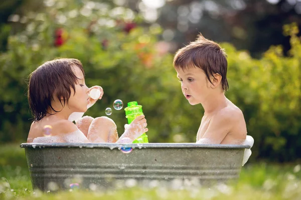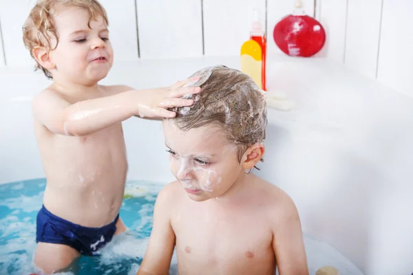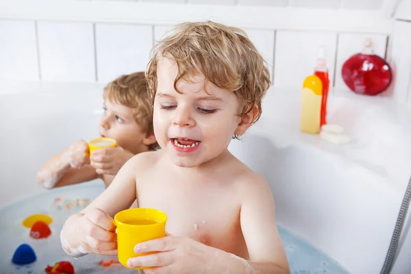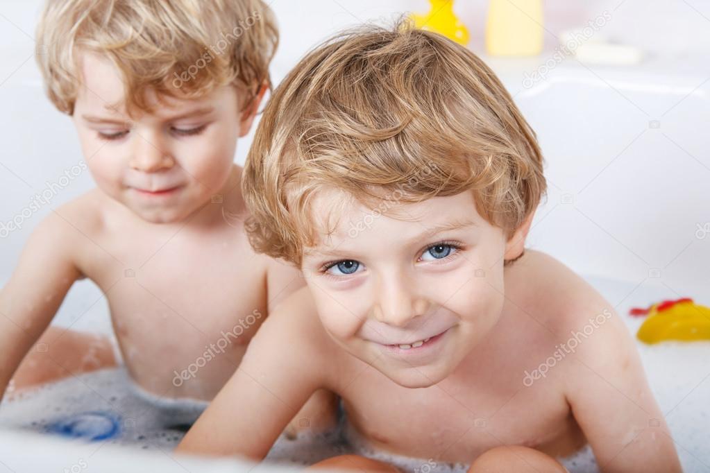 Happy Frères Et S?urs: Deux Petits Jumeaux Garçons Jouant Avec De L'eau En Prenant Un Bain Dans La Baignoire Banque D'Images et Photos Libres De Droits. Image 28901289
