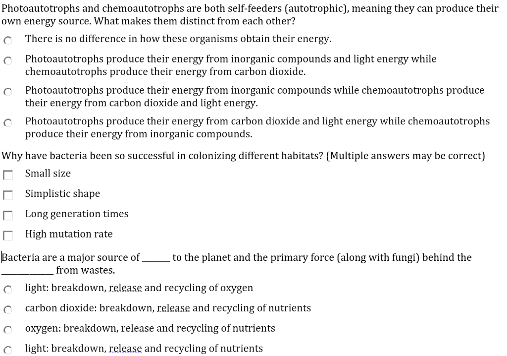 SOLVED: Discuss the different microbial nutritional requirements of: chemoautotrophs vs chemoheterotrophs vs. photoautotrophs vs. photoheterotrophs?