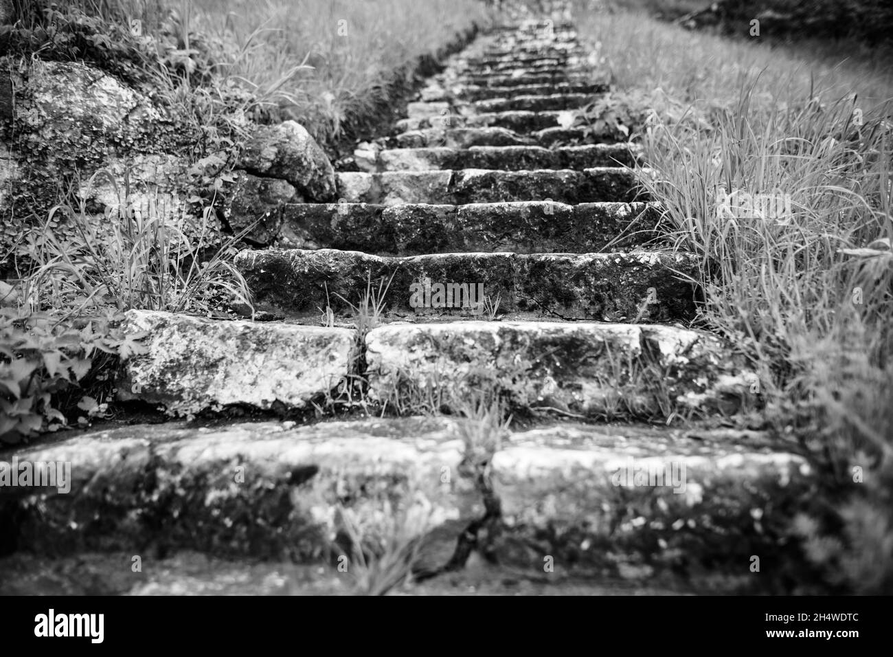 Image de faible profondeur de champ (mise au point sélective) avec des marches médiévales en pierre du Moyen-âge à l'intérieur du château de Bran, également connu sous le nom de château de