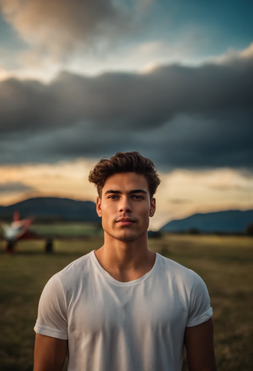Une photo moyenne d'un jeune homme avec un avion en arrière-plan, regarder dans la caméra, détails réalistes, photo prise avec un Nikon D850, Parfaitement éclairé - SeaArt AI