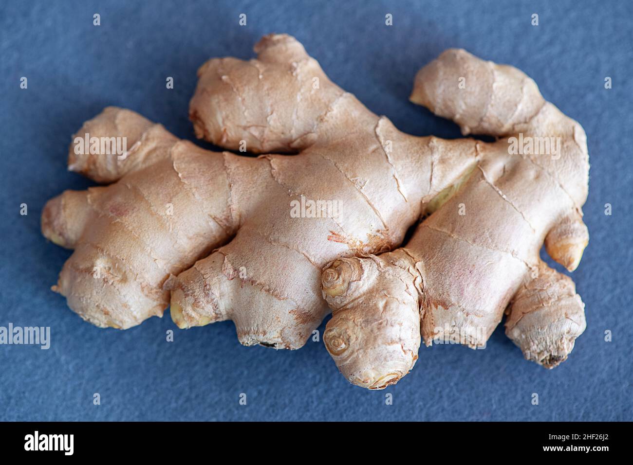 Racines de gingembre frais sur fond bleu clair, le rhizome de la Zingiber officinale, délicieuse plante comestible utilisée dans divers plats Photo Stock - Alamy