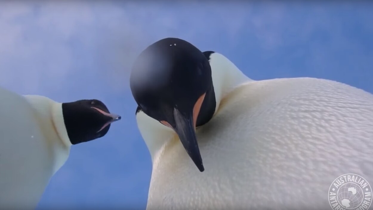Deux manchots empereurs trouvent une caméra et se filment | Radio-Canada