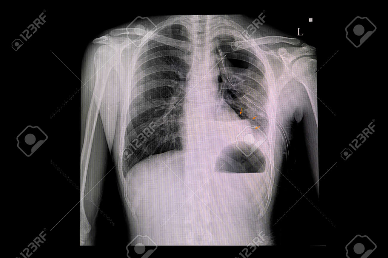 Radiographie Pulmonaire D'un Patient Avec ICD Gauche Et Quantité Modérée D'hydro-pneumothorax Gauche. Banque D'Images et Photos Libres De Droits. Image 176117158