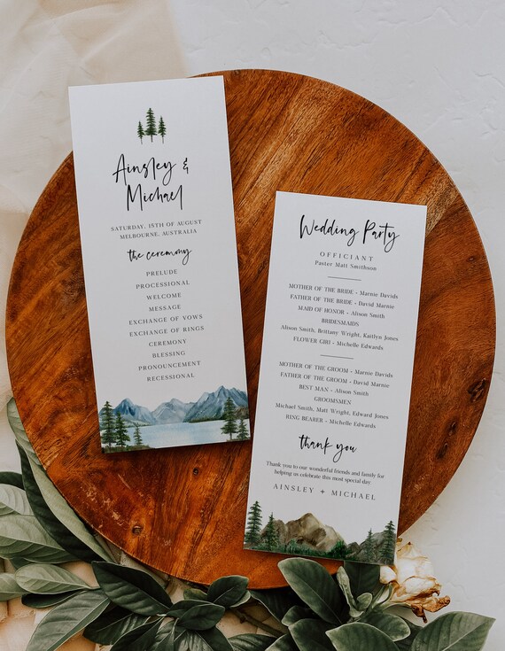 Modèle modifiable de programme de mariage de montagne, programme de mariage de lac, mariage rustique, ordre imprimable de service, programme de cérémonie, Boho, BD124 - Etsy France