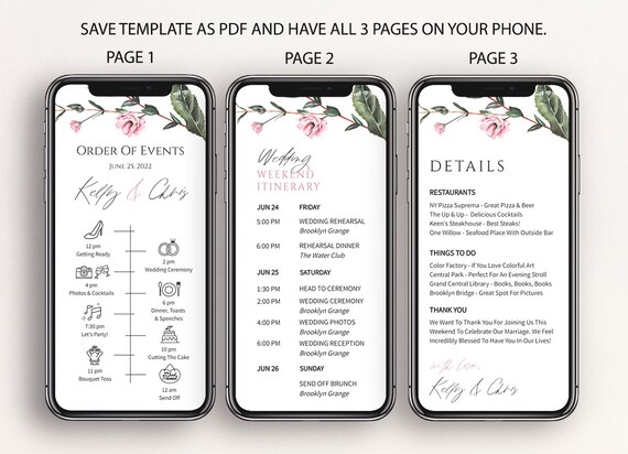 Modèle ditinéraire de week-end de mariage, chronologie numérique, programme dévénement, infographie à télécharger instantanément, détails du mariage de fleurs - Etsy France
