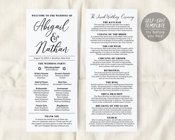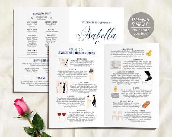Infographie du programme de mariage juif, programme bifold, modèle de cérémonie modifiable, mariage infographique juif, guide du programme de mariage religieux - Etsy France