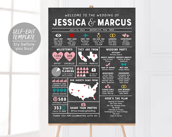 Modèle de signe de programme de mariage d'infographie de tableau modifiable, signe de bienvenue de mariage, affiche de mariage unique, alternative de programme de mariage - Etsy France