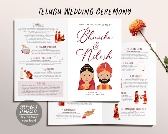 Modèle de programme de cérémonie telugu, guide de cérémonie de mariage indien modifiable, infographie du sud indien, hindou, programme de mariage moderne plié - Etsy France