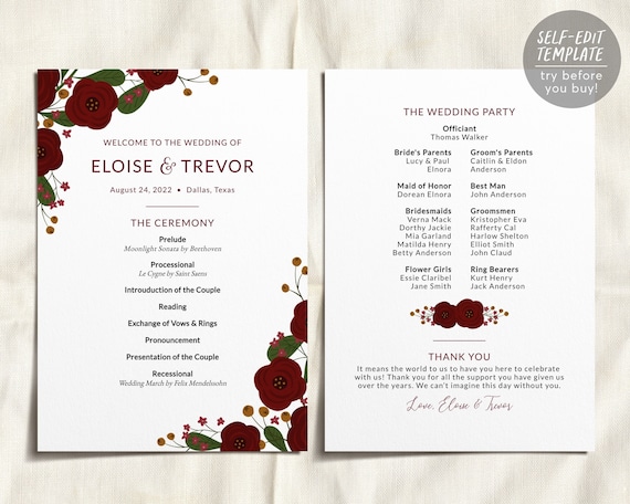 Modèle de programme de mariage floral de Bourgogne, programme de réception de mariage moderne, mariage dautomne, modèle modifiable imprimable, verdure botanique - Etsy France