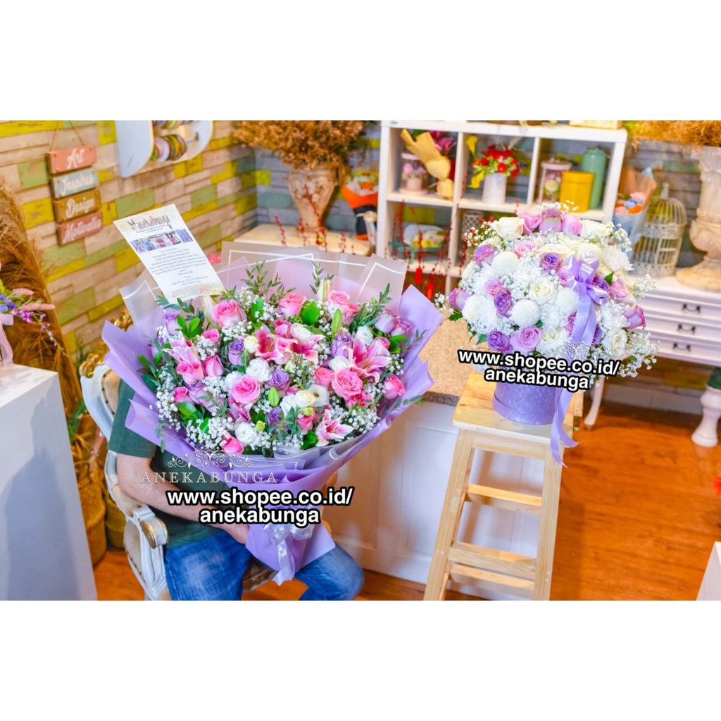 Buket Bunga Asli Ungu Pink Purple Fresh Hand Bouquet Flower Bucket Box