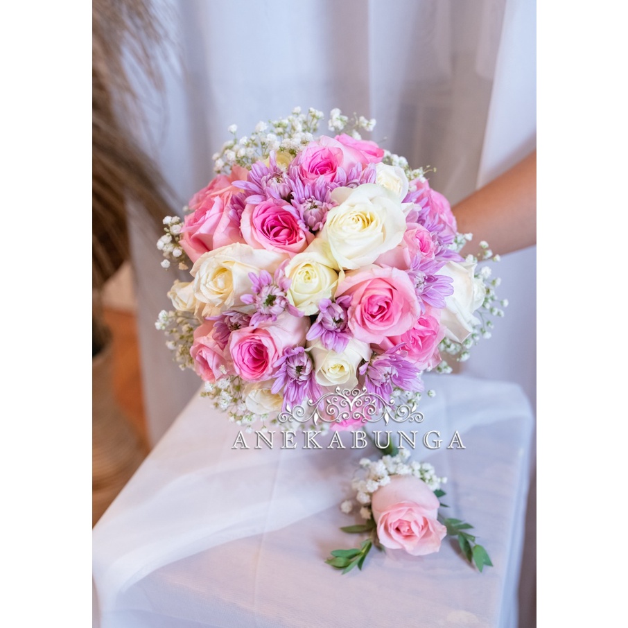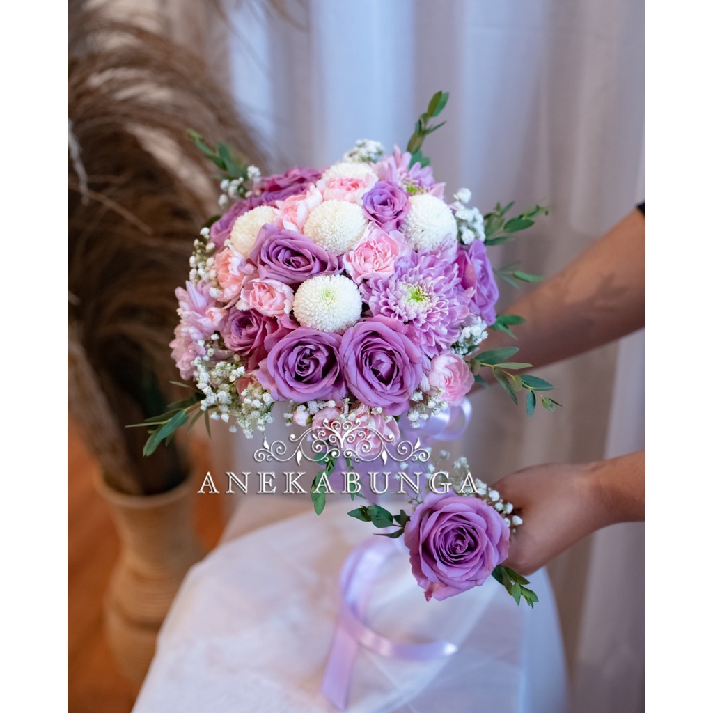 Buket Pernikahan Korsase Bunga Mawar Segar Wedding Bouquet Corsage Flowers Bride Putih Pink Ungu box