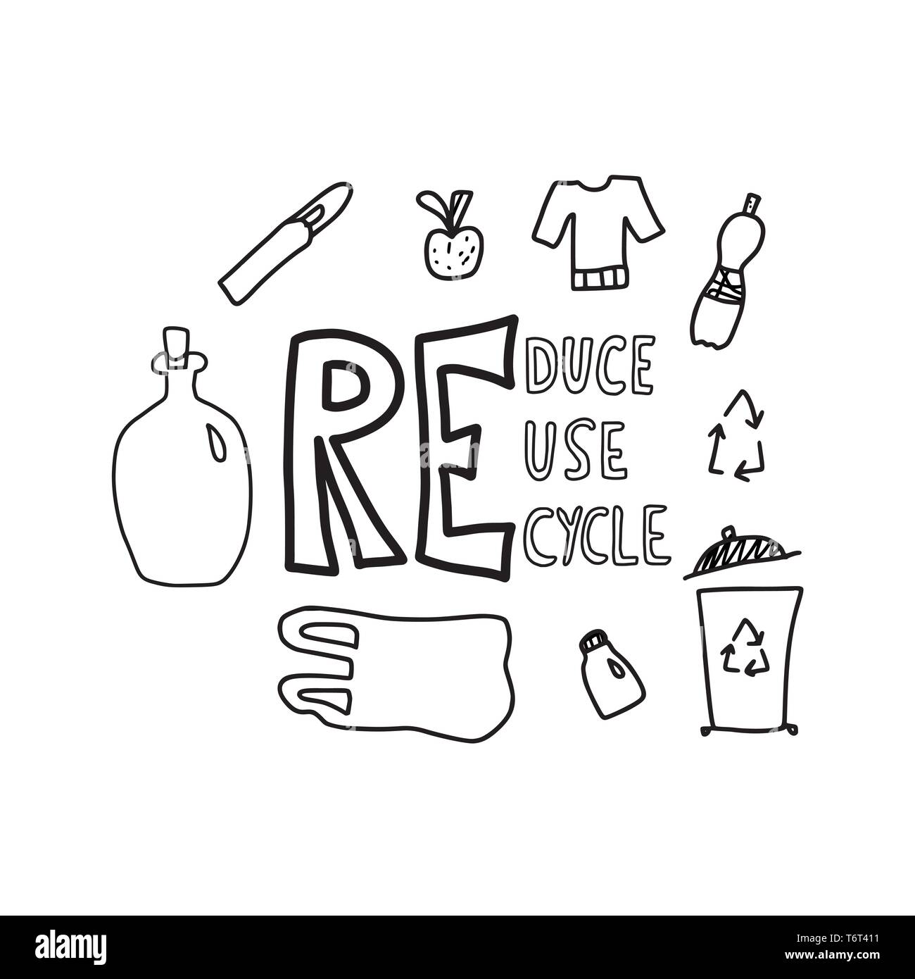 Réduire, Réutiliser, Recycler Le Concept De Doodle. Illustration Vectorielle En Noir Et Blanc Pour Cartes Postales, Estampes Ou Pour Cahier De Coloriage. Mode De Vie Écologique. Clip Art Libres De Droits, Svg,