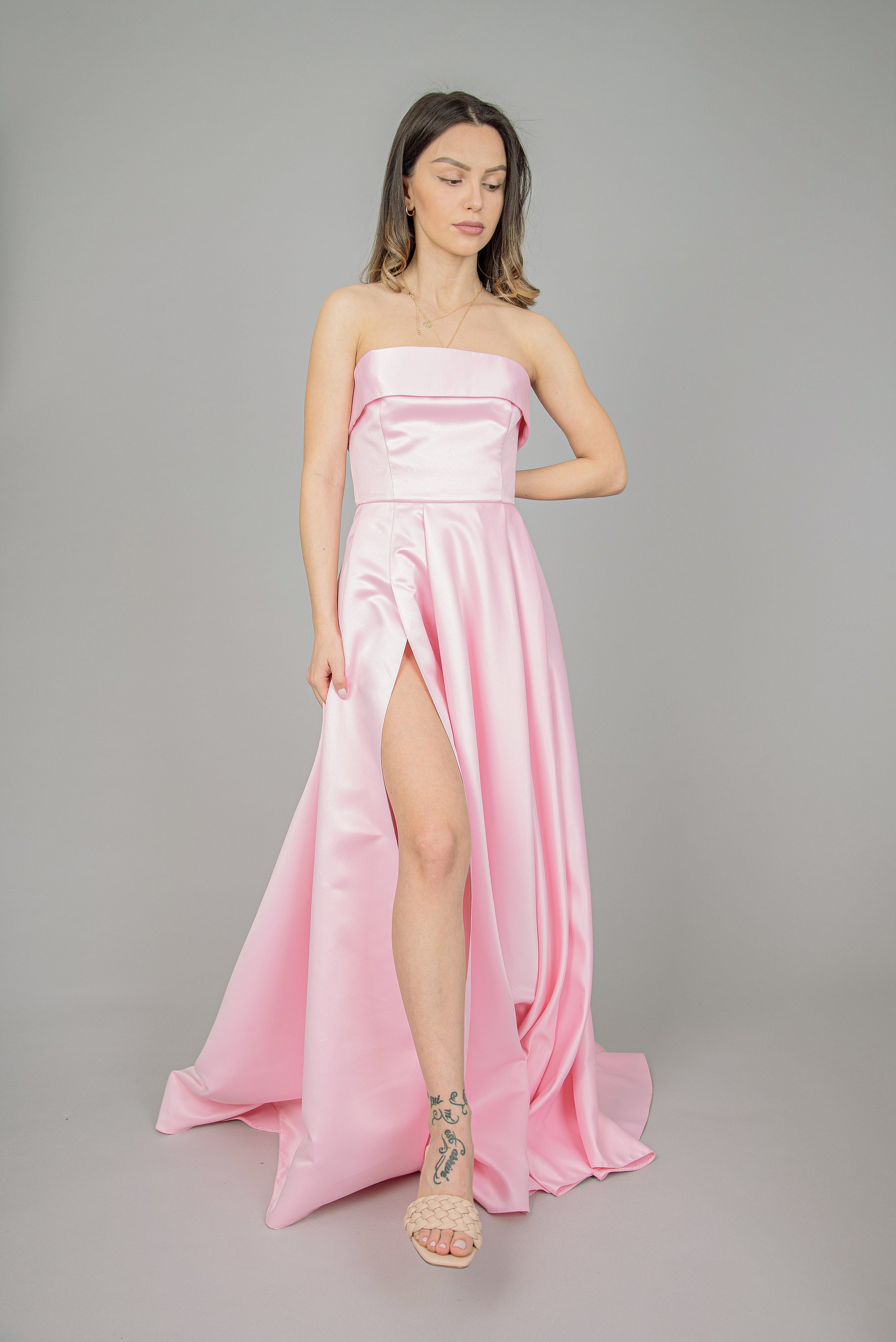 Robe De Soirée Chic Et Glamour Bustier Longue Satin Rose Avec Fente