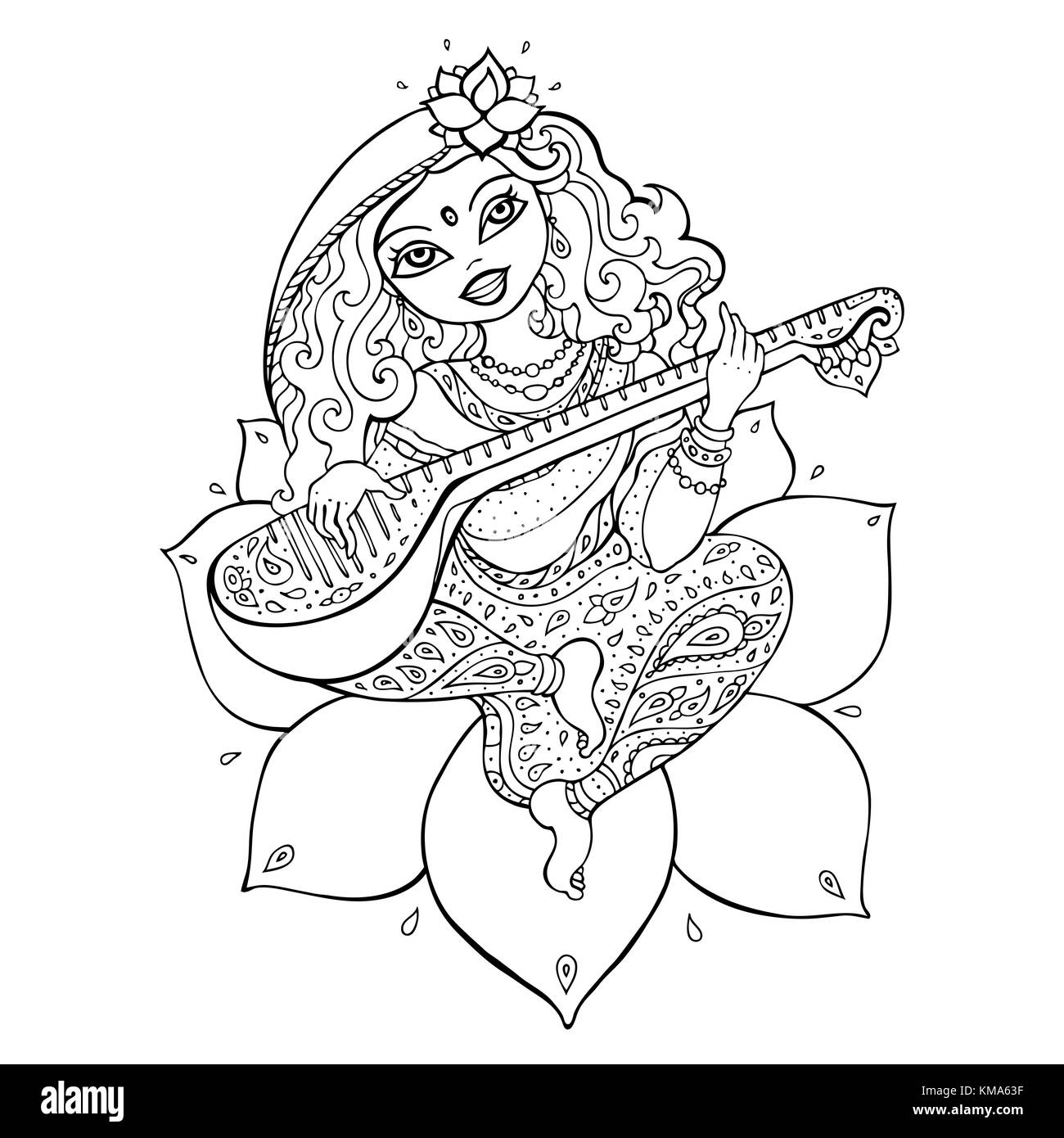 Dessin en noir et blanc de Saraswati déesse hindoue indienne Image Vectorielle Stock - Alamy