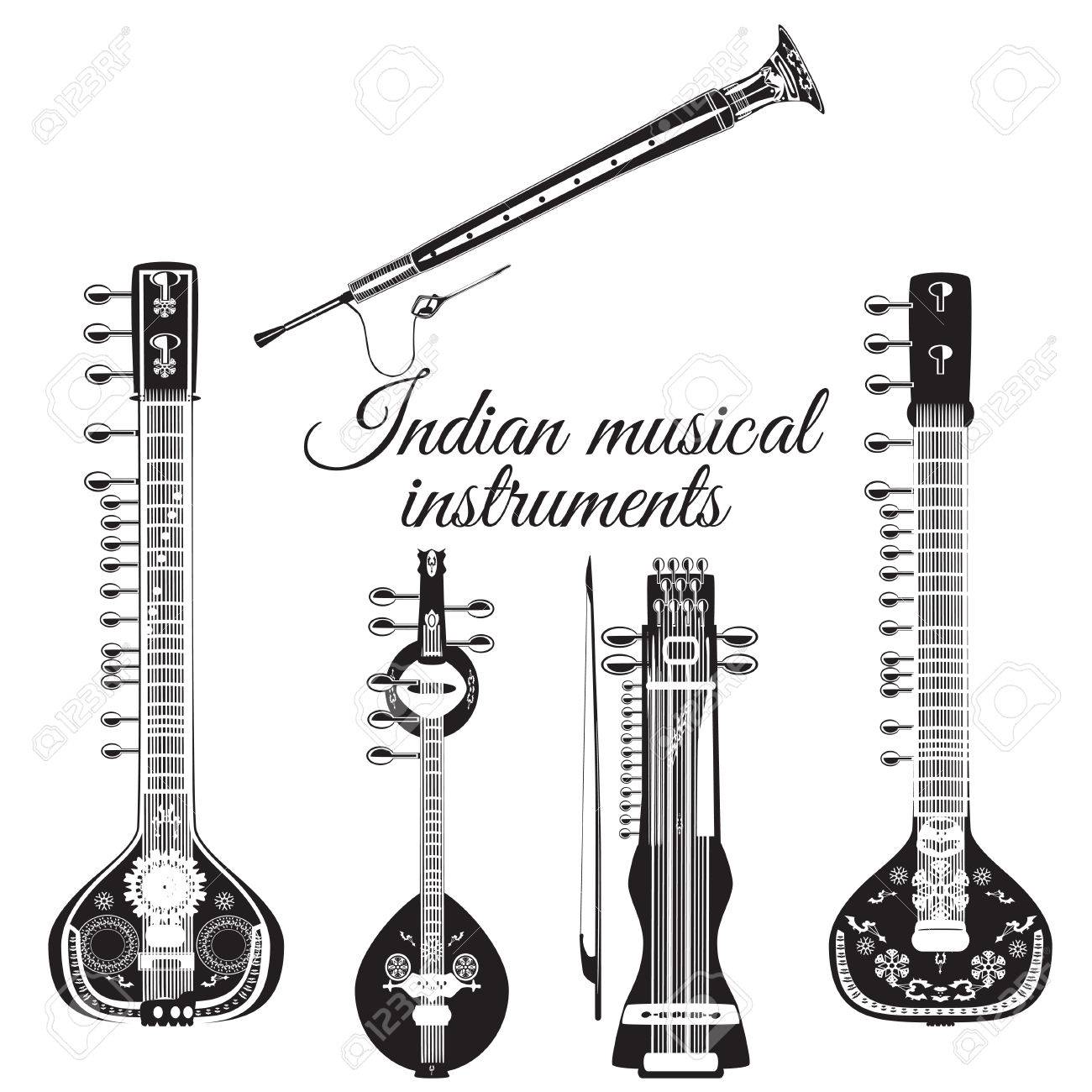 Vector Ensemble Noir Et Blanc D'instruments De Musique Indiens, Style Plat. Sarangi, Sitar, Icônes De Saraswati Veena Et Shehnai Isolés Sur Fond Blanc. Clip Art Libres De Droits, Svg, Vecteurs Et Illustration.