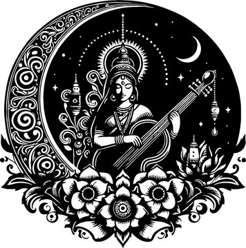 Heureux Vasant Panchami Saraswati. Icône Dans Le Style Linéaire. Illustration Noir Et Blanc Clip Art Libres De Droits, Svg, Vecteurs Et Illustration. Image 70446521