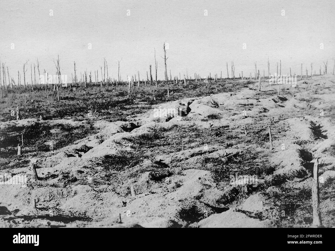La première Guerre mondiale en France. Les restes d'une forêt après quelques heures de bombardements d'artillerie lourde. Tranchées construites à la hâte au premier plan Photo Stock - Alamy