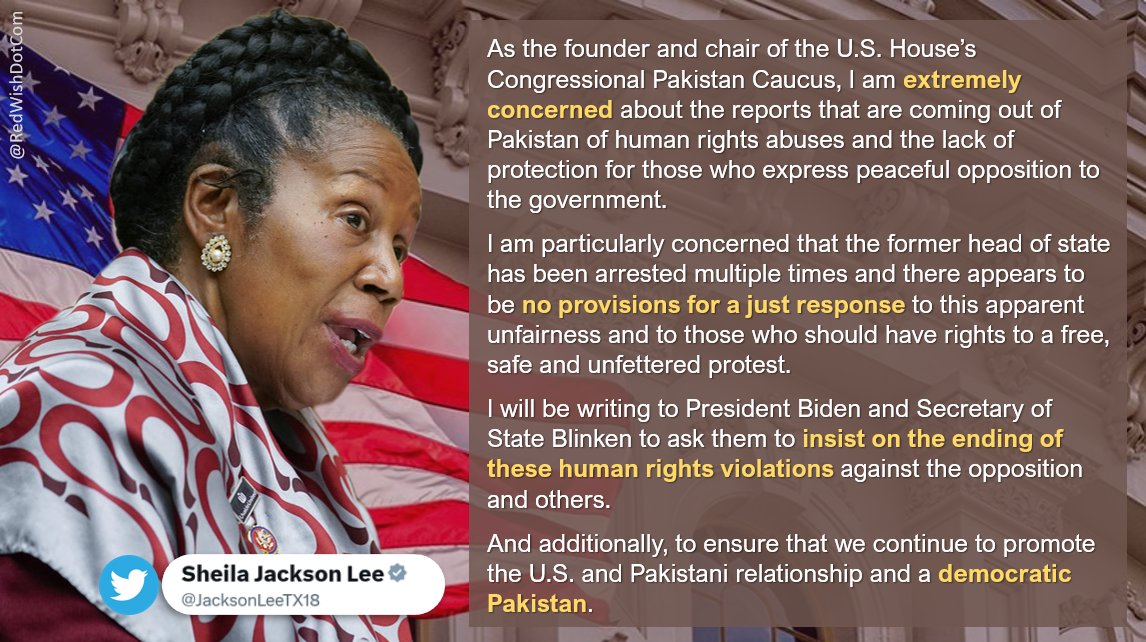 PTI USA Official on X: "Congresswoman Sheila Jackson Lee (D-TX) expressed her extreme concern about human rights abuses in Pakistan. She said she will be writing to President Joe Biden and Secretary