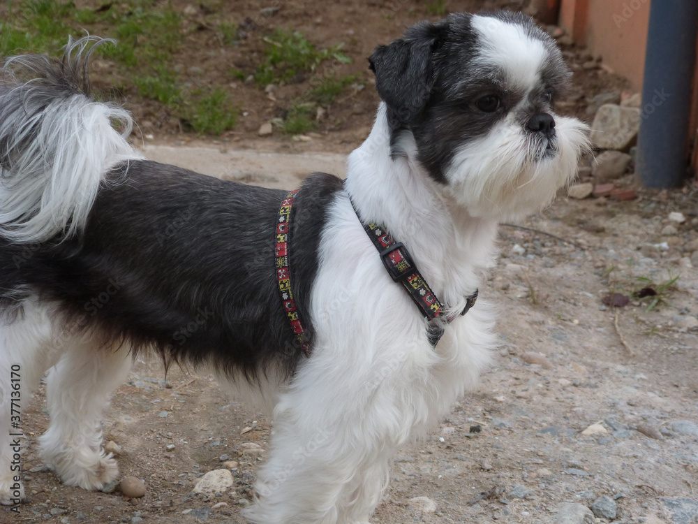 Chien shih tzu, noir et blanc, mâle adulte en position de garde. Stock Photo | Adobe Stock