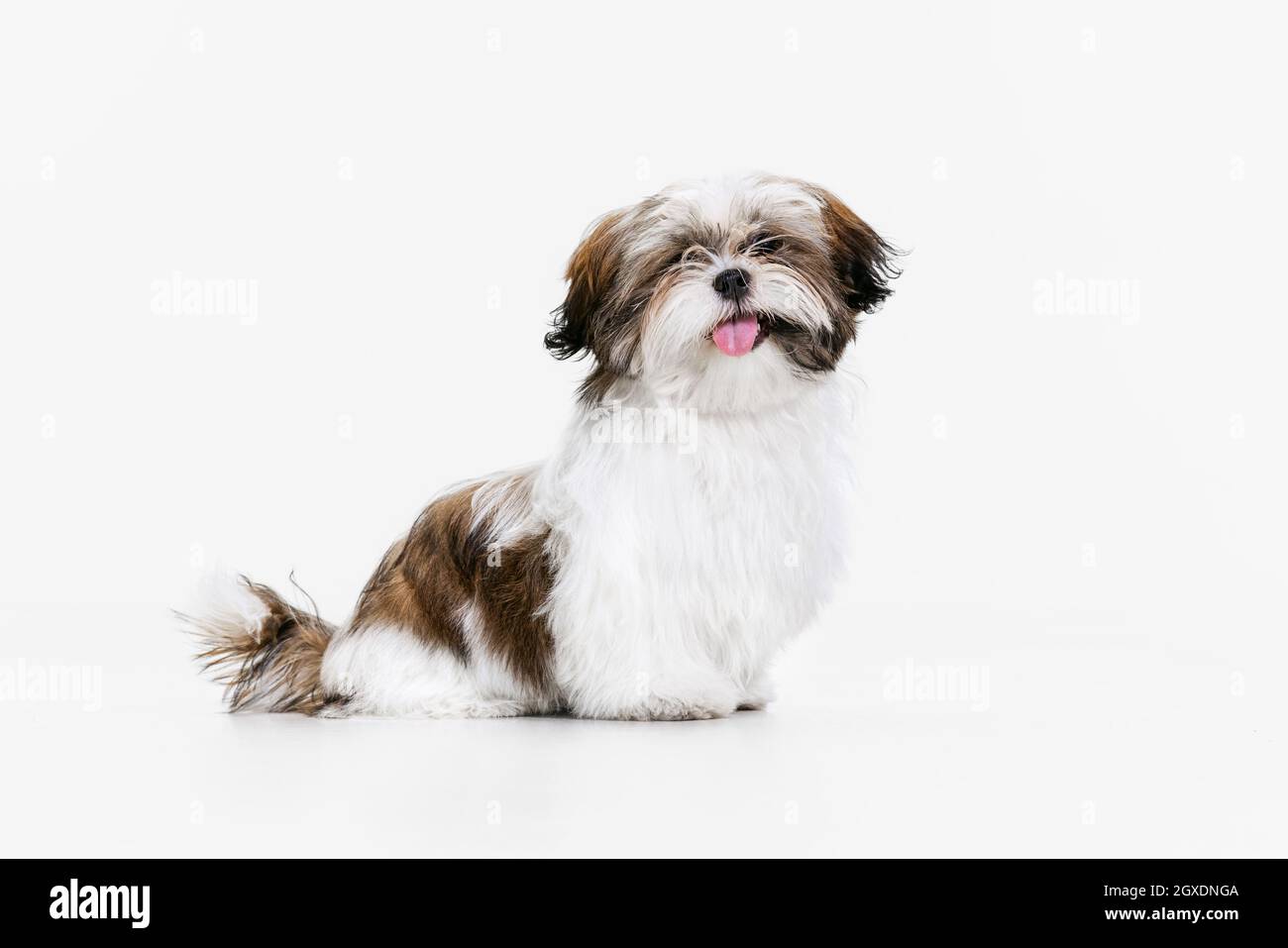 Portrait d'un joli chien brun blanc, petit chiot Shih Tzu isolé sur fond blanc de studio. Concept de la vie animale, des soins, de la responsabilité des animaux de compagnie Photo Stock -