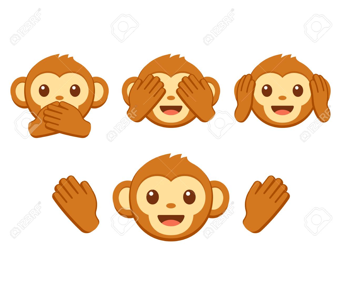 Singes Sages Singe Mignon Avec Les Mains Couvrant La Bouche, Les Yeux Et Les Oreilles Singe Sourd Et Muet Aveugle Voir Entendre Et Ne Parler Aucune Illustration Vectorielle De Dessin Animé Maléfique |