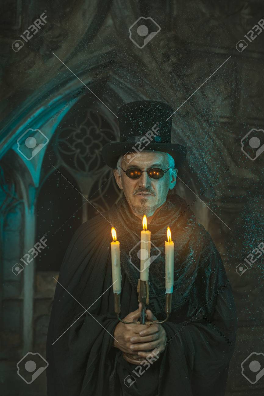 Sorcier Maléfique Avec Le Lustre Dans Les Mains De La Nuit ...