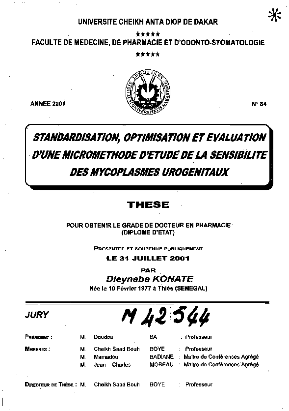 PDF) STANQARDISATION, OPTIMISAtIONETEVALUATION. D'UNEMICROMETHODED'ETUDEDELASENSIBILITE DES MYCOPLASMES UROGENITAUX | Abdoul Aziz Ndour - Academia.edu