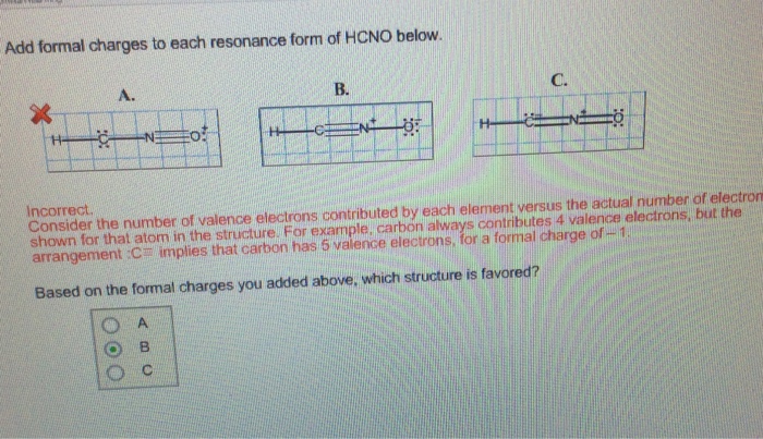 SOLVED: Add formal charges to each resonance form of HCNO. Resonance structure A Resonance structure B 5 SnE 0; 5 ncnct Incorrect Resonance structure C Based on the formal charges you added,