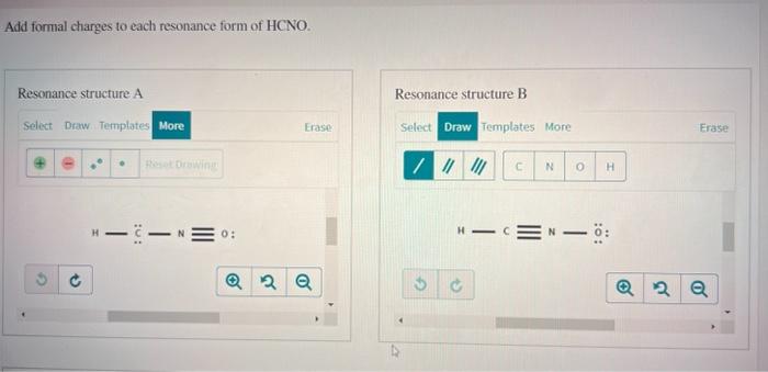 SOLVED: Add formal charges to each resonance form of HCNO. Resonance structure Resonance structure B Select Draw Erase Select Draw Ring Erase Resonance structure C Based on the formal charges you added,