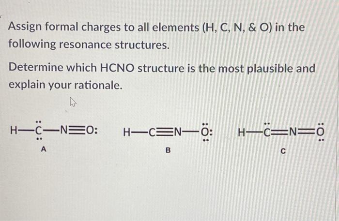SOLVED: Assign formal charges to all elements (H, C, N, O) in the following resonance structures. Determine which HCNO structure is the most plausible and explain your rationale. H-C=N=O: H-C=N- : HILC =