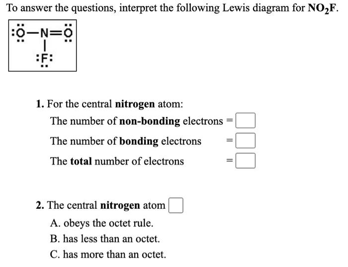 SOLVED: To answer the questions, interpret the following Lewis diagram for NO2F: 1. For the central nitrogen atom: - The number of non-bonding electrons: - The number of bonding electrons: - The