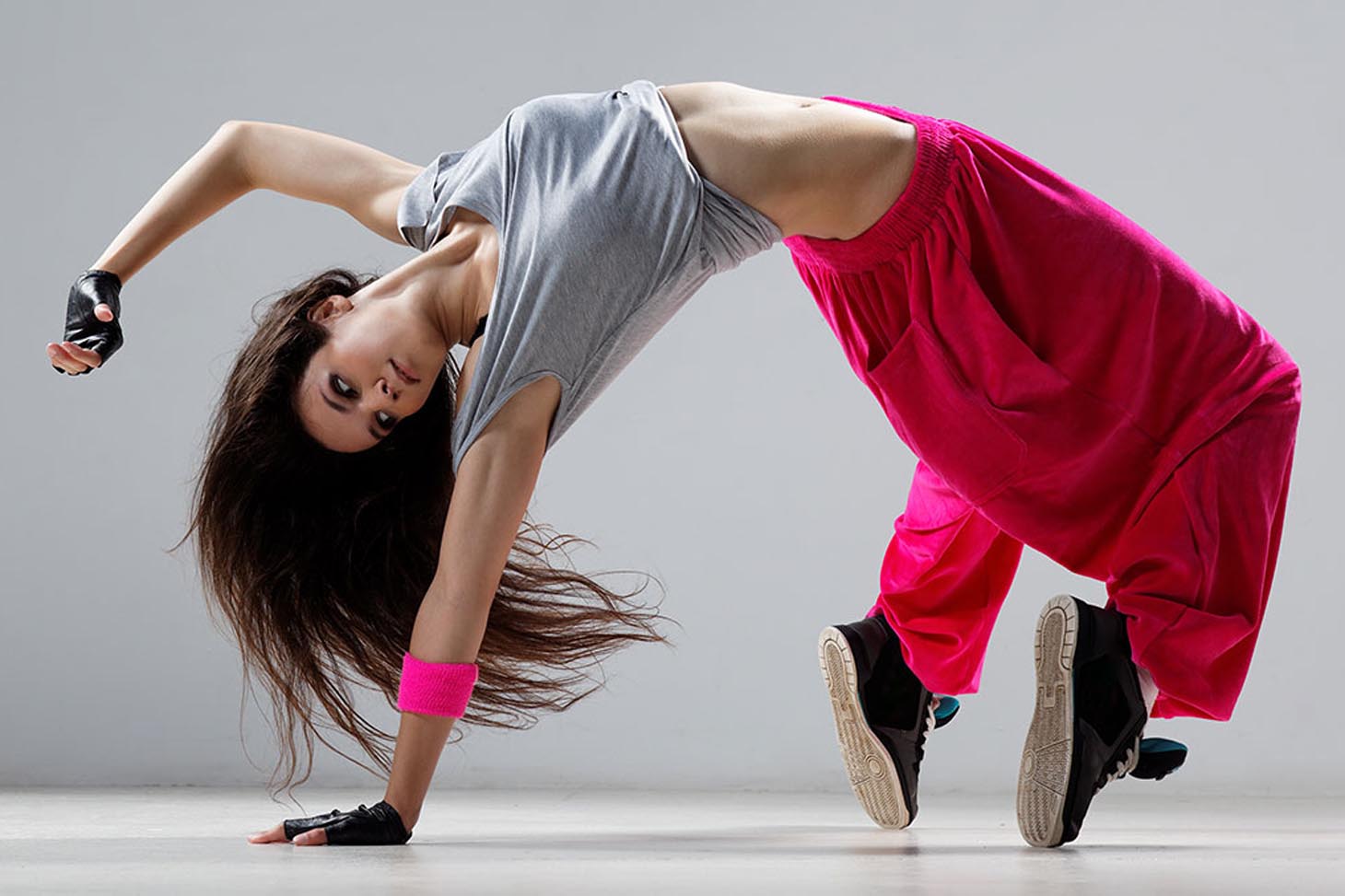 Girls dancing hip-hop in stylish clothes on gradient background at dance hall in neon light. Stock Photo by ©[email protected] 379267888