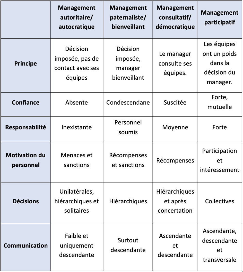 Les styles de management : autoritaire, parternaliste, consultatif, participatif