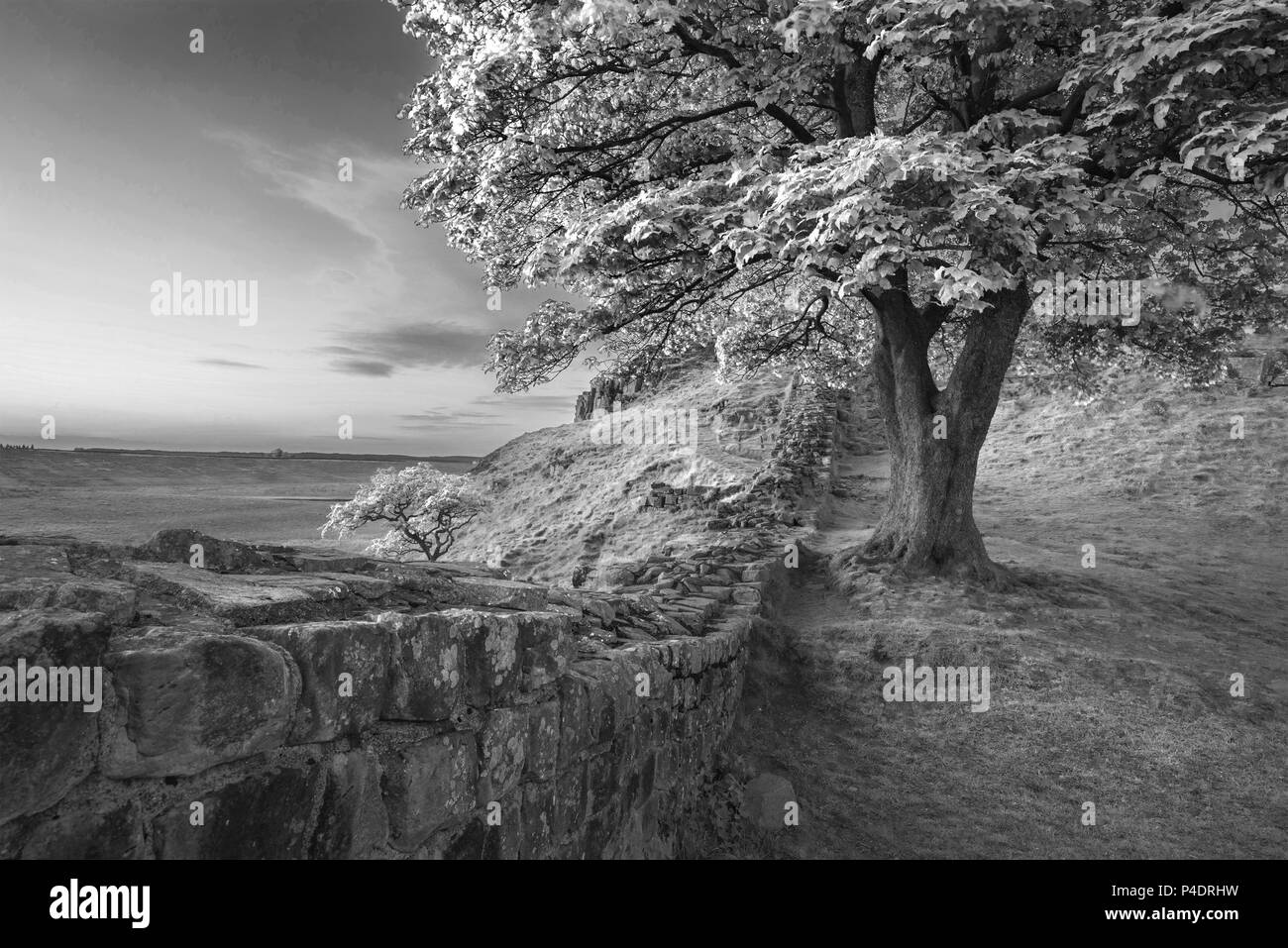 Superbe image paysage noir et blanc de l'écart au niveau du mur d'Hadrien, dans le Northumberland au coucher du soleil avec une superbe lumière de la fin du printemps Photo Stock -