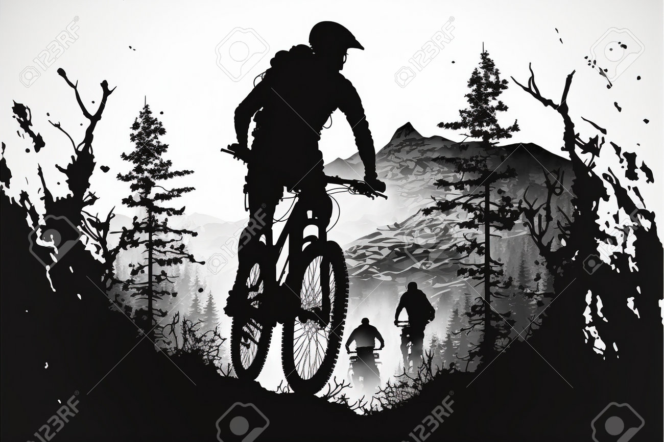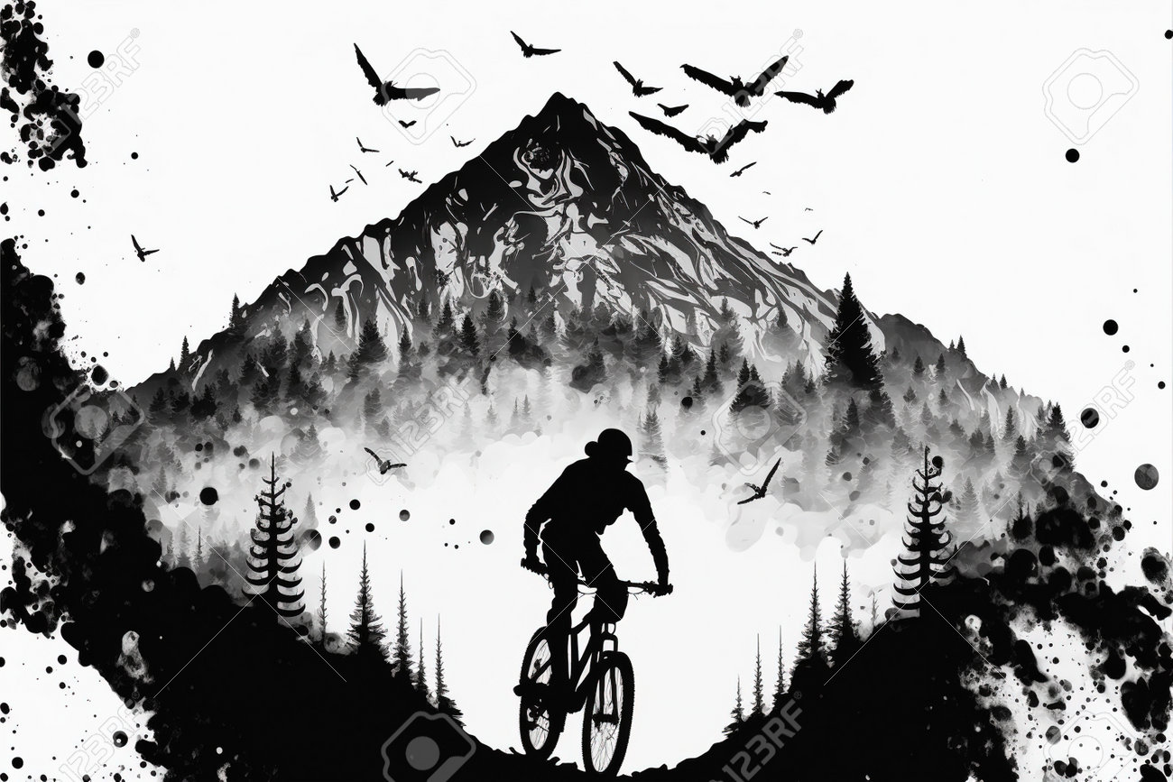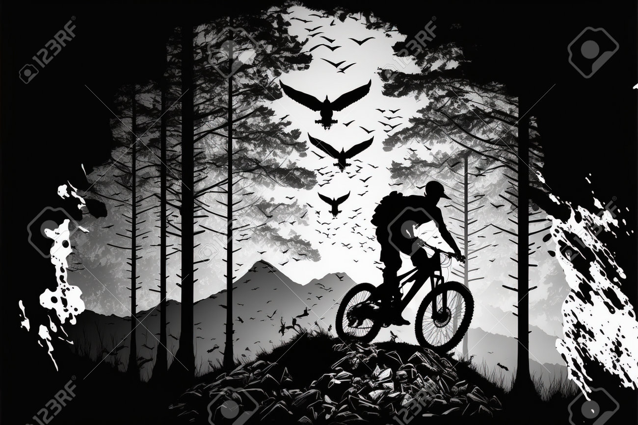 Vététiste Noir Et Blanc Avec Double Exposition De Forêt Et De Paysage De Montagne Sport Extrême De Plein Air Dans La Nature Avec Fond De Silhouette Superbe Ai Générative Banque D'Images et