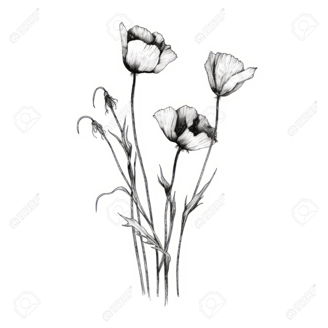 Une Superbe Illustration Minimaliste D'un Bouquet De Fleurs À L'encre Sur Fond Blanc, Cette Œuvre Capture Les Détails Complexes De La Nature Qui Rappelle Le Style D'illustrateurs Minimalistes Comme Tami Bone Et