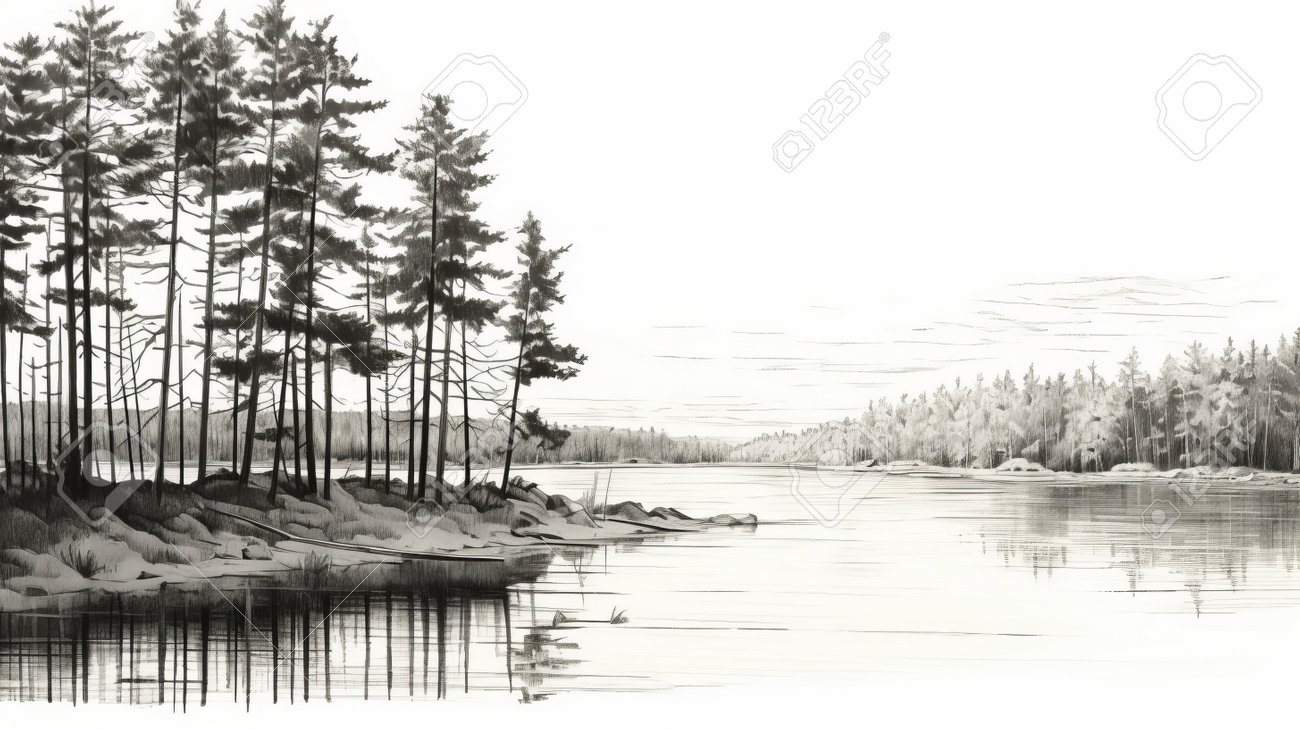 Une Superbe Illustration De Style Aquarelle En Noir Et Blanc D'une Rivière Mettant En Valeur Sa Beauté Et Sa Tranquillité. L'image Capture L'essence De La Nature Sauvage Avec Sa Perspective Aplatie Et