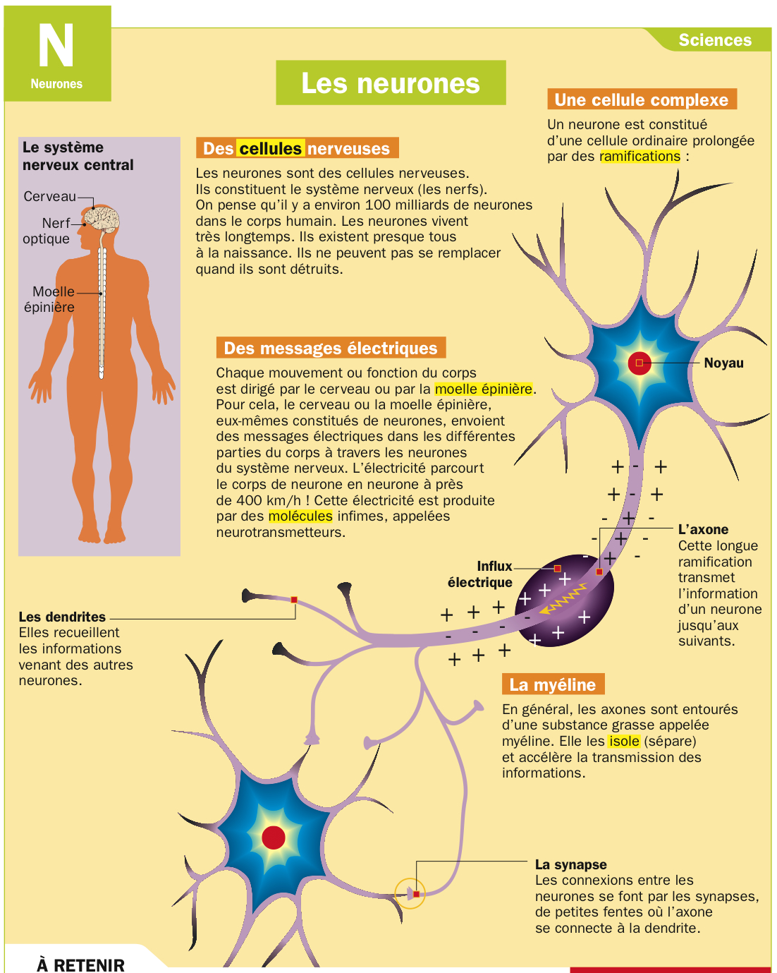 Neurosciences - Les neurones : Les neurones sont des cellules nerveuses qui constituent un réseau dans notre cerveau : on en compte près de 100 milliards ! Ils communiquent entre eux par
