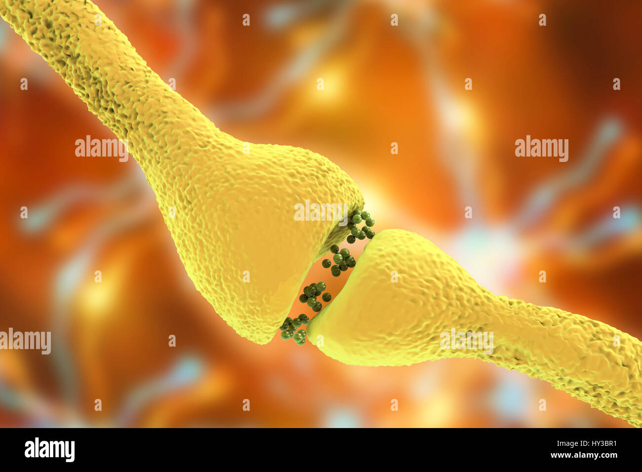 Synapse. Illustration d'ordinateur d'une synapse, la jonction entre deux neurones. Synapses transmettent les signaux électriques d'une cellule nerveuse à l'autre. Lorsque le signal atteint la synapse elle déclenche la libération de substances