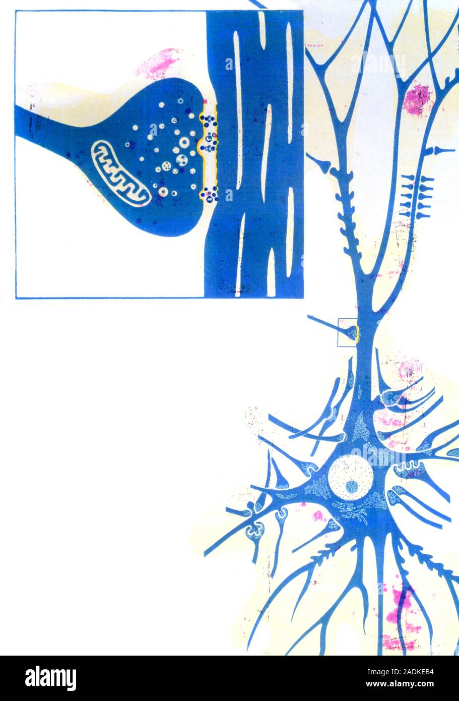 Les cellules nerveuses et les synapses. Artwork d'une cellule nerveuse (neurone) du cerveau avec un gros plan d'une synapse. Le corps des cellules nerveuses est en bas à droite. Il a un