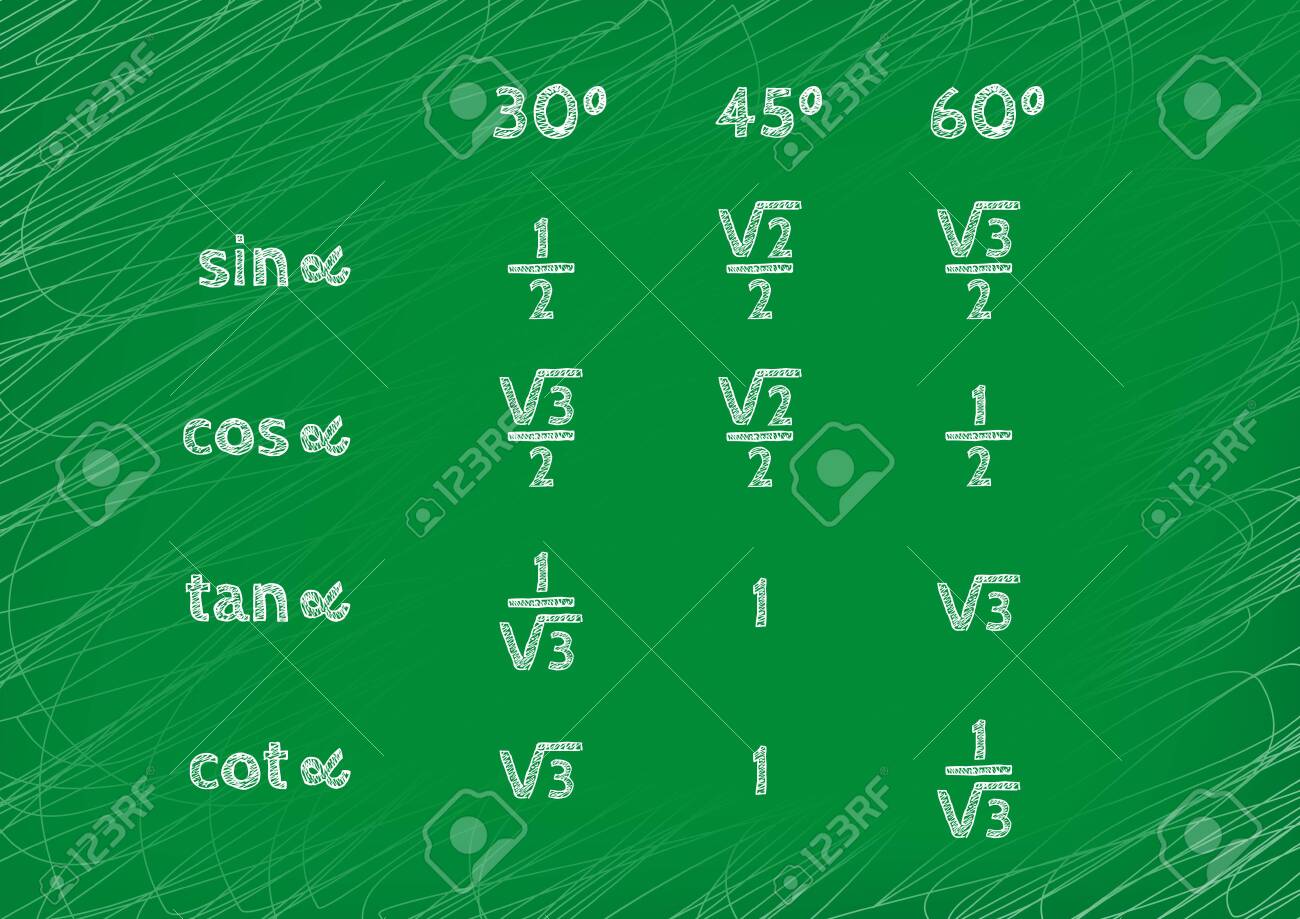Un Tableau Trigonométrique Avec Les Valeurs Des Fonctions Sinus, Cosinus, Tangente Et Cotangente. Écriture À La Main Sur Un Tableau Noir Vert. Présentation Graphique Pour Les Professeurs De Mathématiques. Banque D'Images et