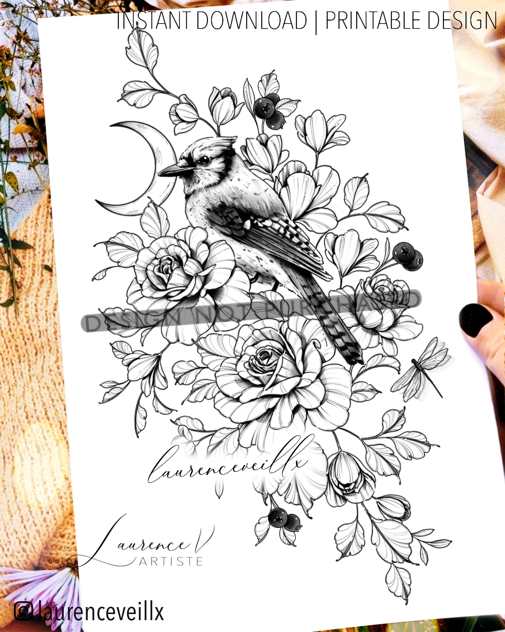 Design de tatouage Téléchargement instantané Geai Bleu Roses et ...
