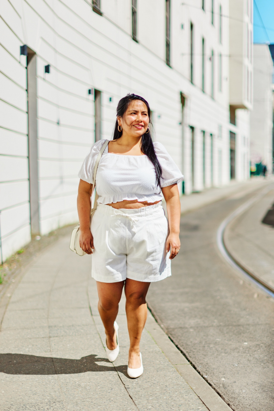 Mode femme été avec un short blanc, un tshirt noir et des baskets ...