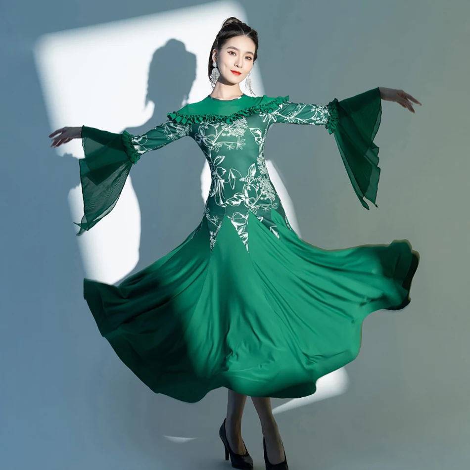 Robe de spectacle de danse de salon pour femmes adultes, robe de valse tango, manches cloche, vert, noir, femme, 6 000 jupes, nouveau, 9038 - AliExpress